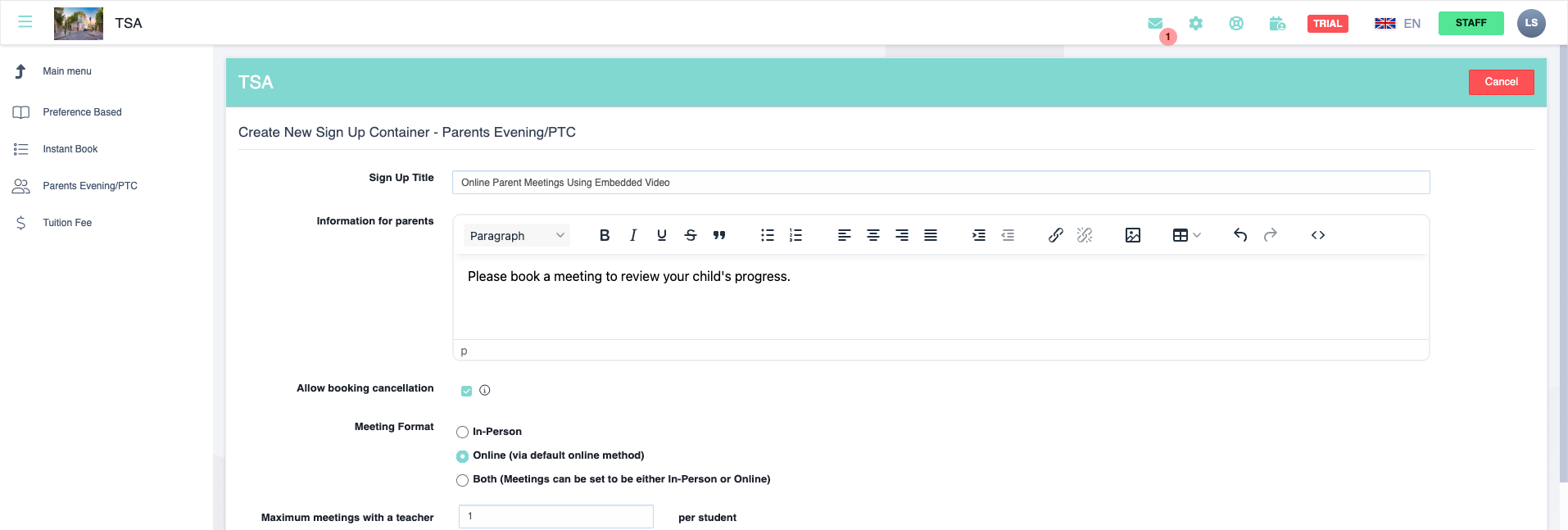 - Allow booking cancellation: If you wish to allow parents to make cancellations/change their chosen time slots, select the box. Parents will see up to date availability of time slots.