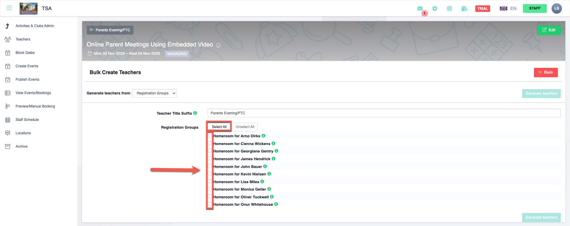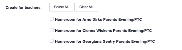 18. If you wish to create the conference for every teacher / registration/subject class, click Select All in Create for Teachers. Alternatively you can select individual teacher groups - do this if you are scheduling different teachers at different times, for example subject class meetings on Monday, Counseling meetings on Tuesday.