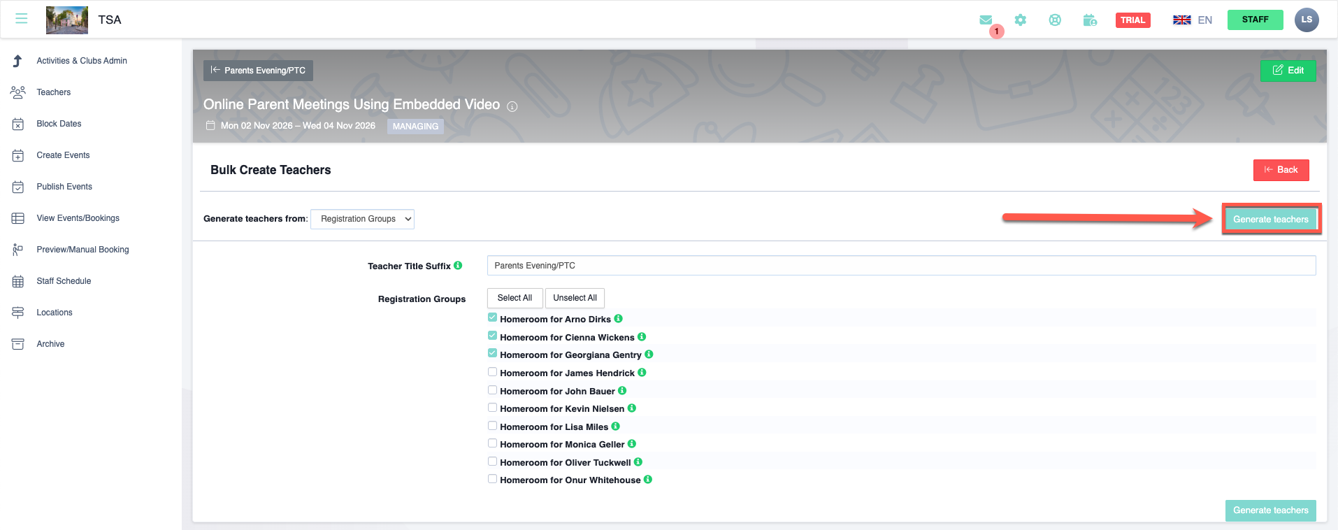 When the classes/registration groups have been selected, click the Generate Teachers button.