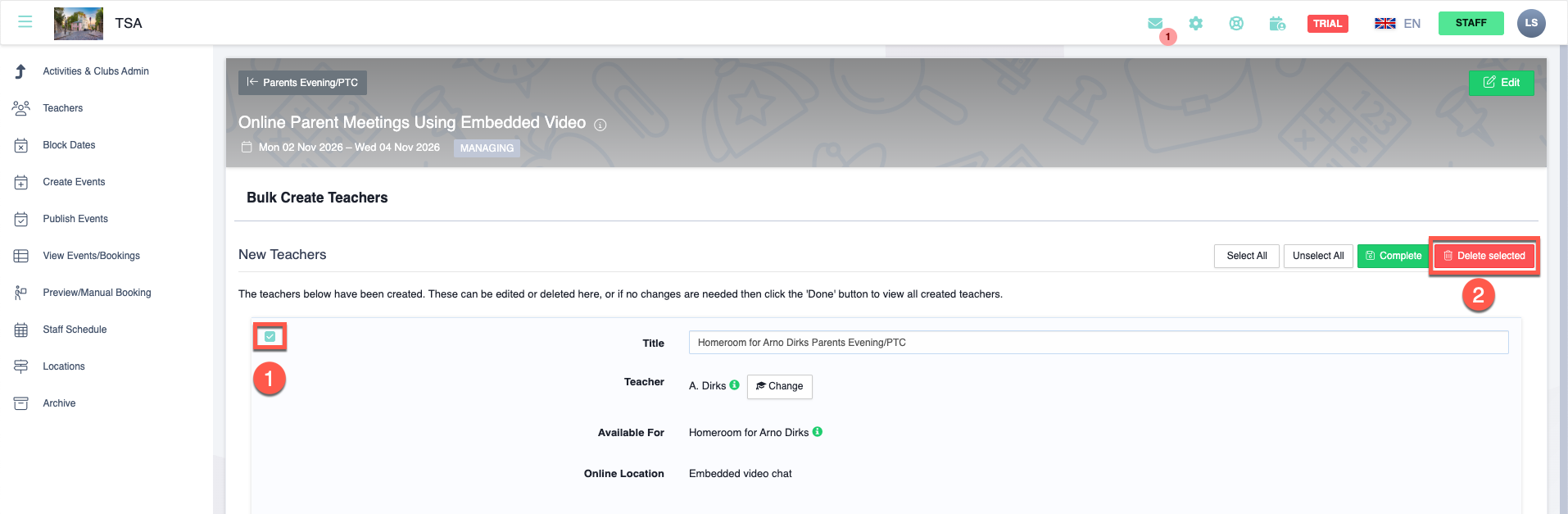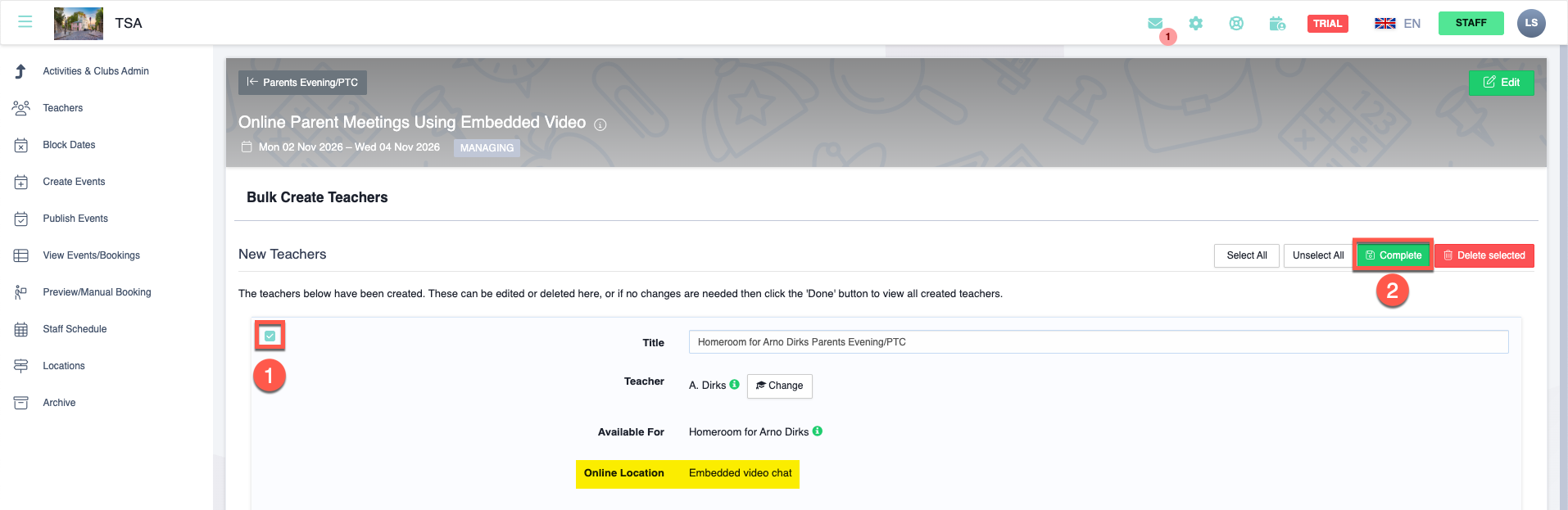 When you are happy with the teachers, check the individual boxes on the left or click Select All and then click Complete. You will see that the Online Location displays Embedded video chat to signify that the meeting will be using embedded video in SchoolsBuddy rather than a Meeting URL.