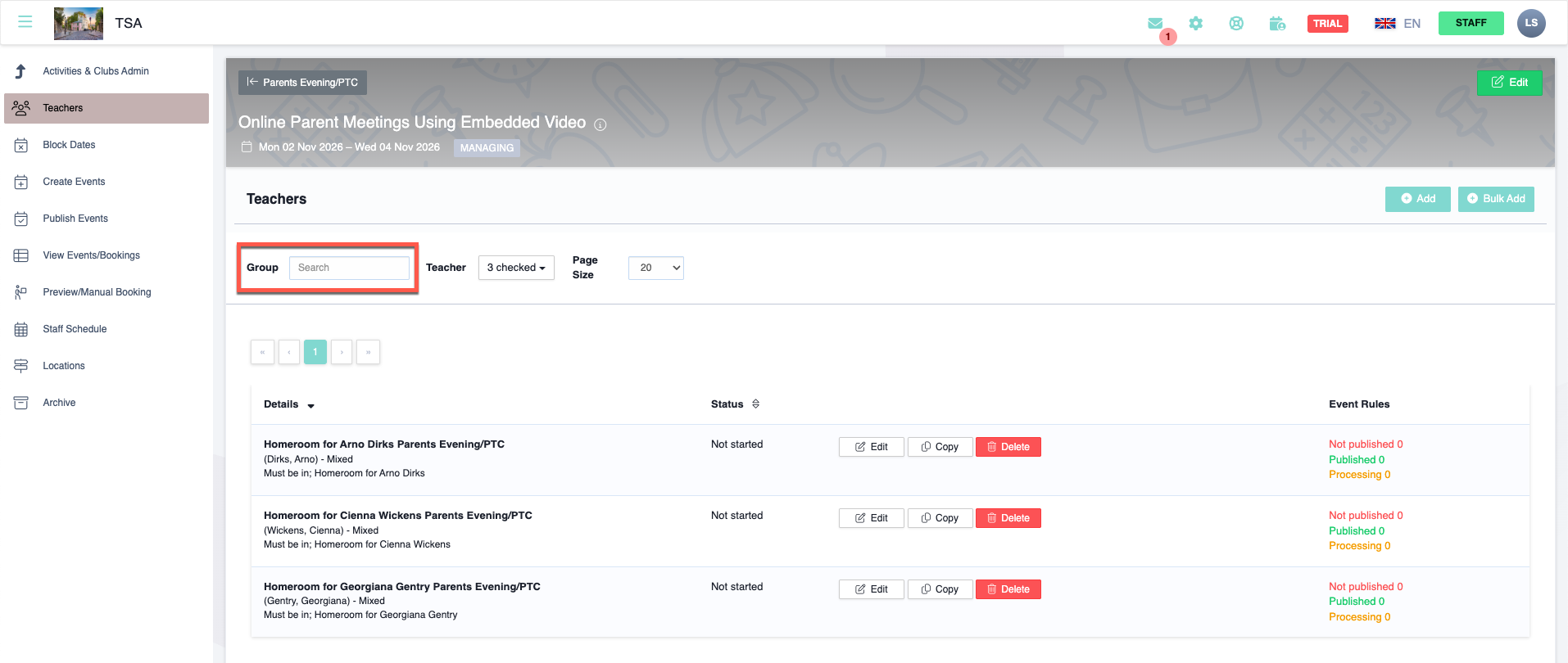 Note: The Group filter shown in the screenshot below is not a search function. It filters results by group name only. If the teacher’s name is also used as the group name, it may appear as though the filter is searching by teacher name.