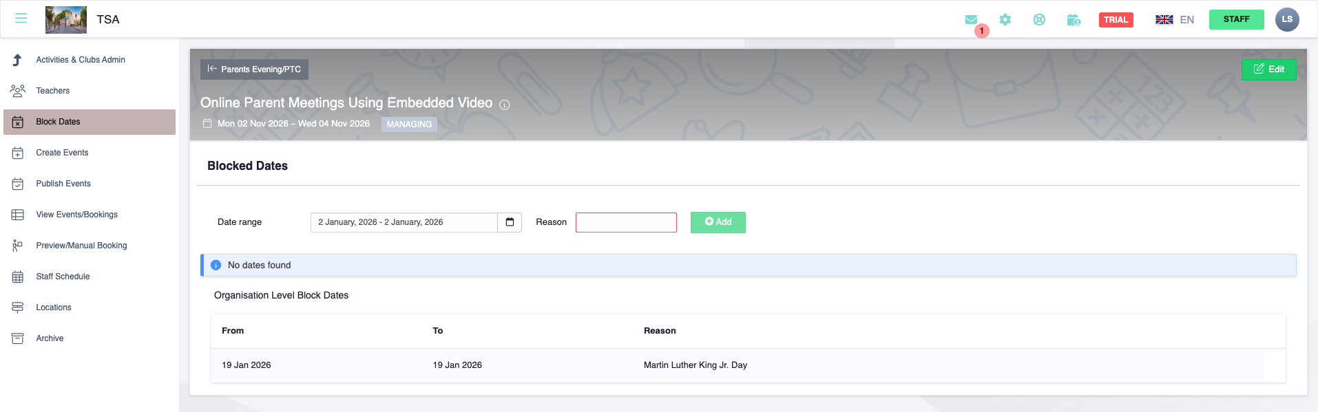 15. Click Block Dates to view any dates that PTCs will not be scheduled on. If you have selected to use the Organisation block dates, these will appear here. You can also add more block dates that only apply to these PTCs rather than to the all school activities if necessary.