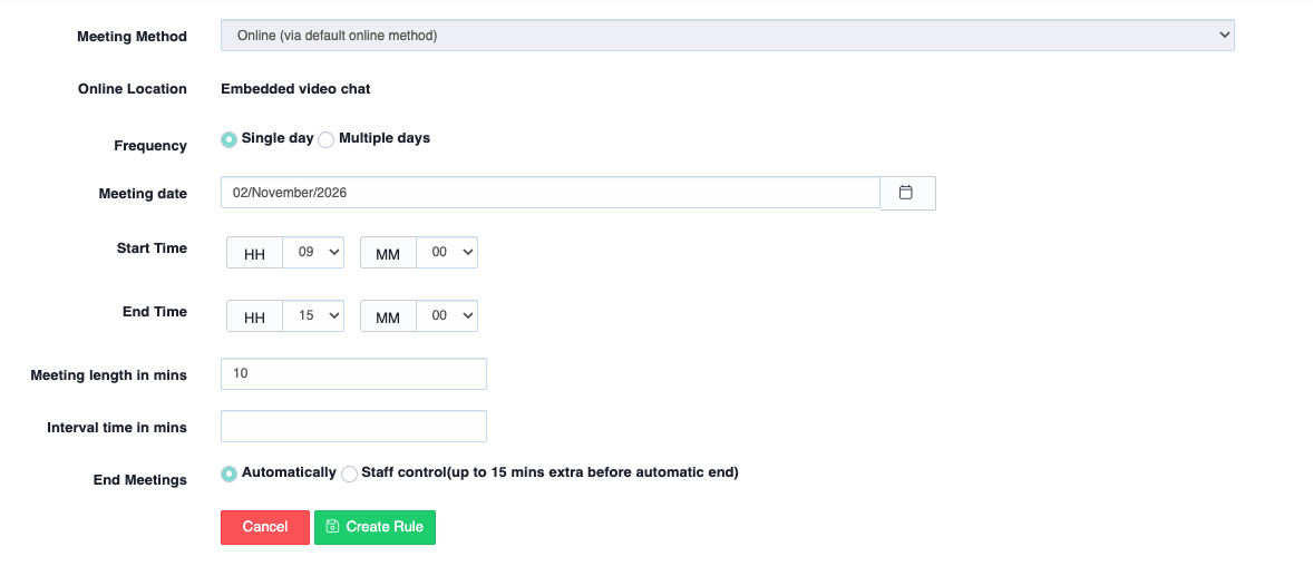 - Interval time in mins: Add a time length if teachers need a break between every meeting.