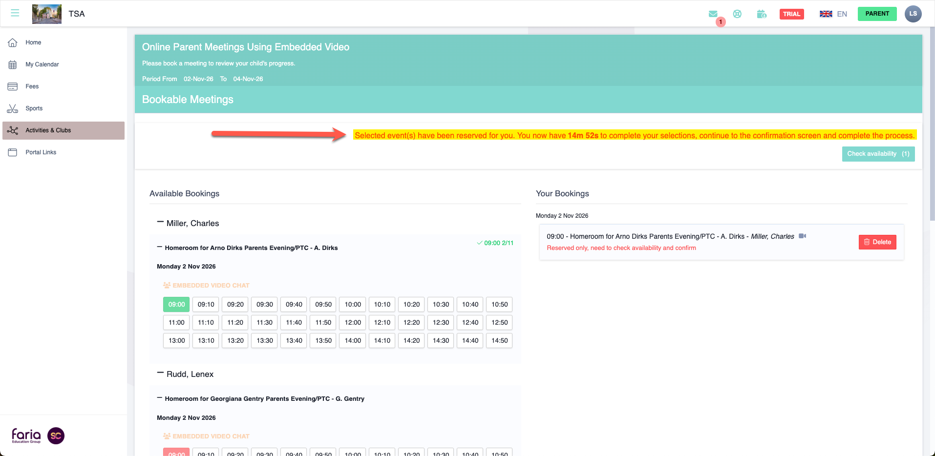 25. Below is an example of the screen parents will see when booking a Parents Evening / Parent Conference meeting. There is a countdown timer (set to 15 minutes from the time of selecting a meeting) which shows the parent how long they have left to Check Availability and complete the booking. If the countdown runs out, they will lose the booking and have to start again.