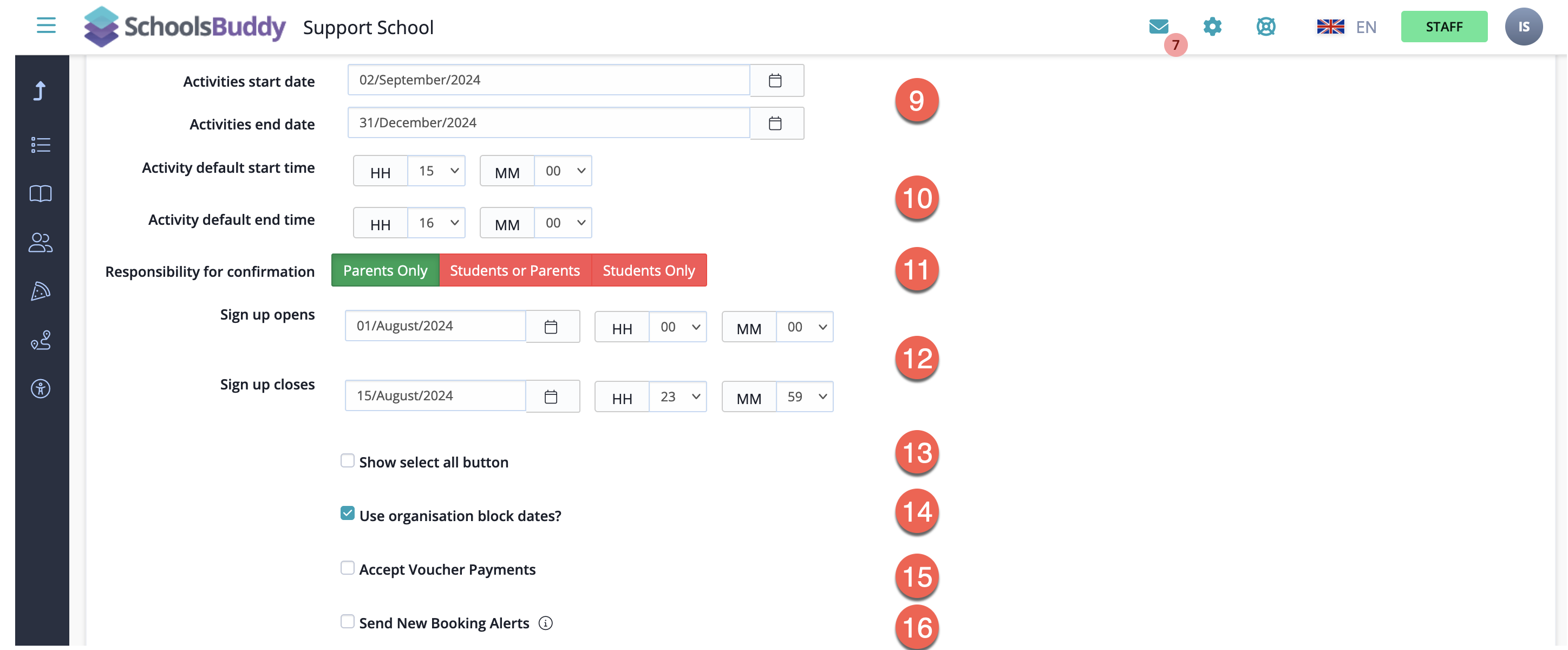 12. Sign up opens/closes: Set the open window for parents to make bookings. This could be the whole term if you allow students to join activities any time.