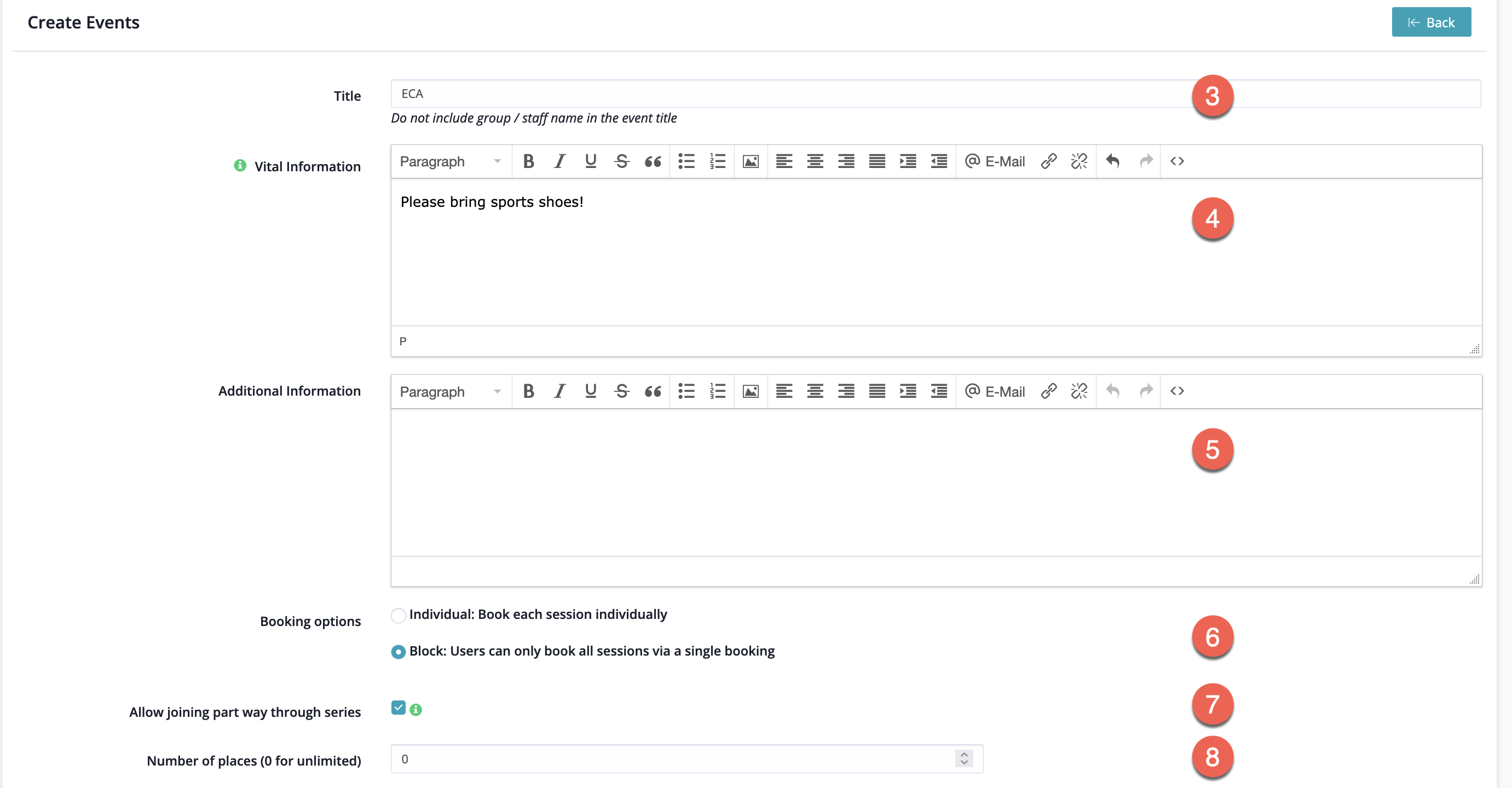 - Vital Information: Any vital information regarding this event. This information will be shown in the parents' diary on the day of the event.