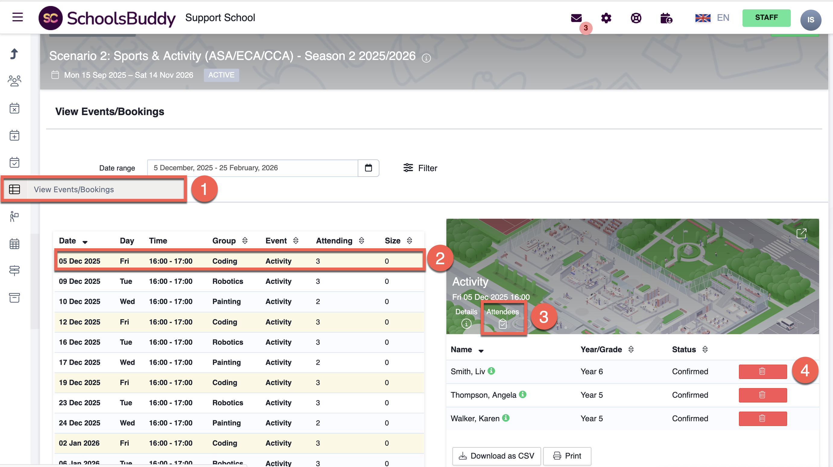 - To delete a student's booking, find the specific student in the list and click the red trash bin icon next to their name to remove them from the event.
