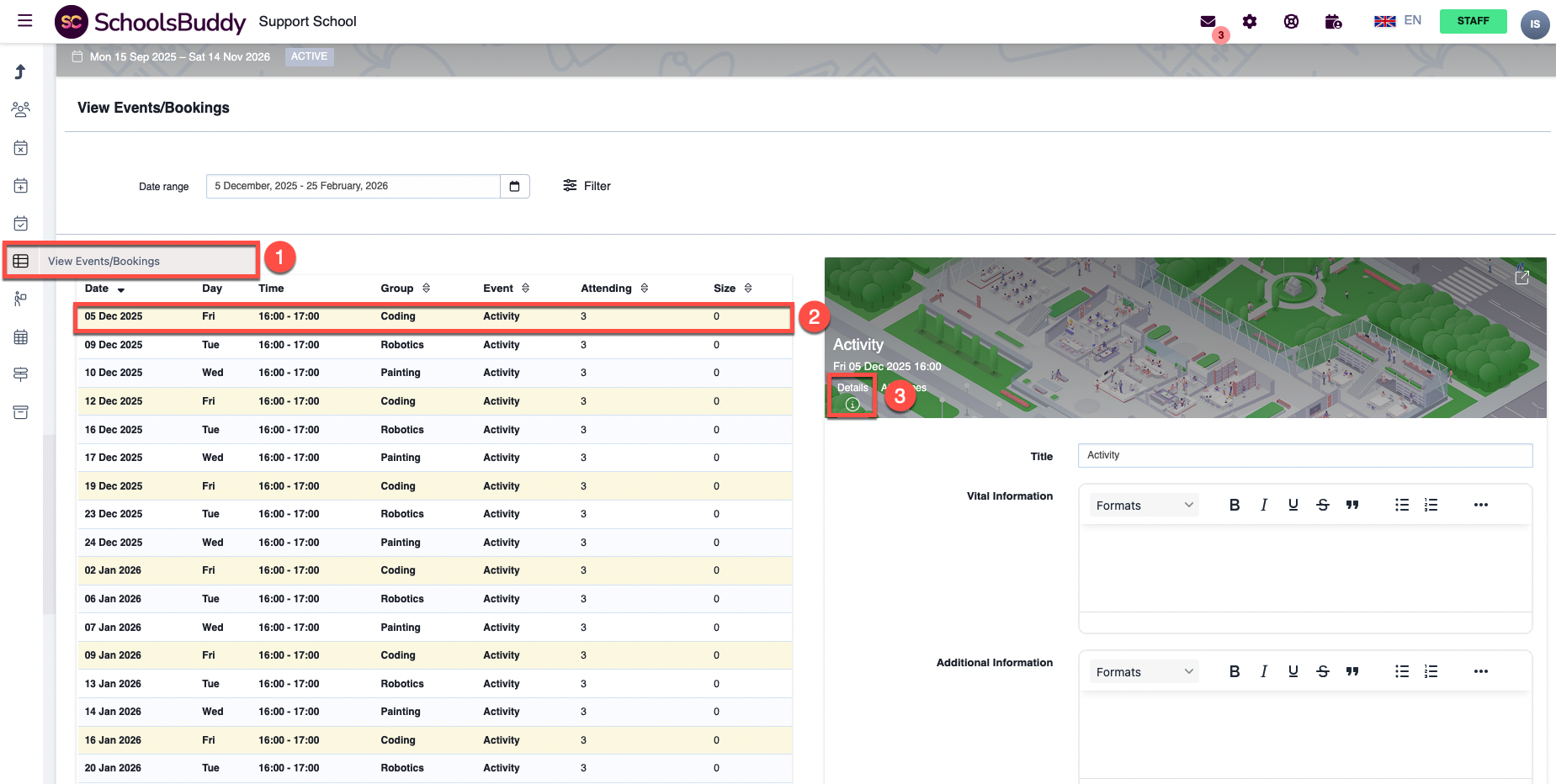 Once the events are published, you can view them in the “View Events/Bookings” tab.