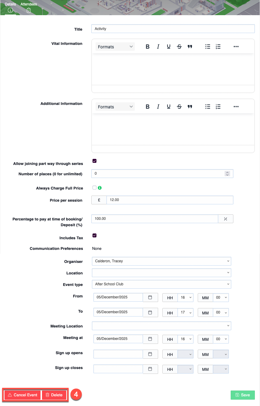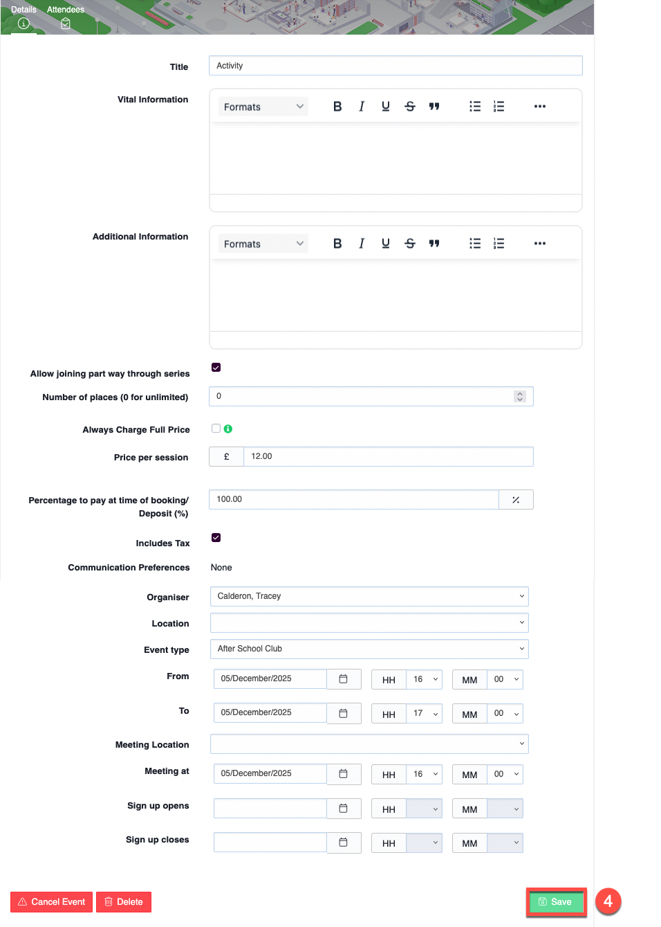 "Allow Join Partway Through" and "Charge Full Price" Settings: These settings are determined by the first event of the series and automatically apply to all subsequent events. They cannot be changed mid-series.