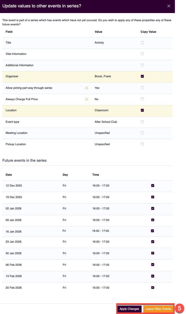 When you click Save, a pop-up message will appear asking whether you want to apply the changes to all future events in the series.