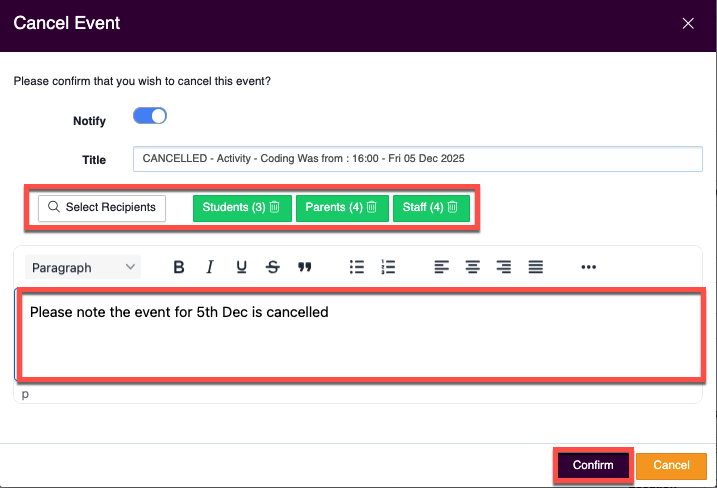 When clicking on "Cancel Event", a pop-up will appear allowing you to send a notification to participants.