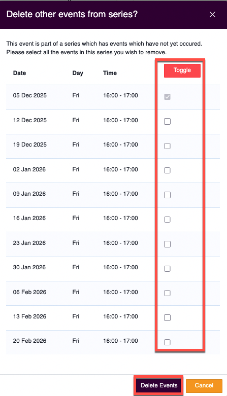 Click Toggle at the top to select all events if you wish to delete the entire series.