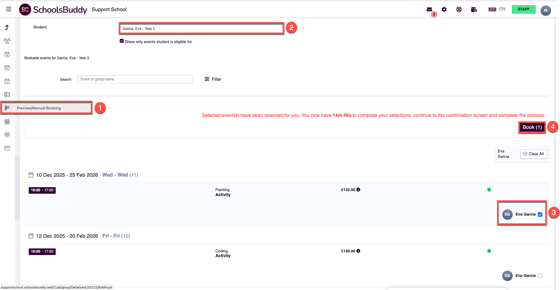 Once events are published, you can perform manual bookings for students. This is useful when you want to: