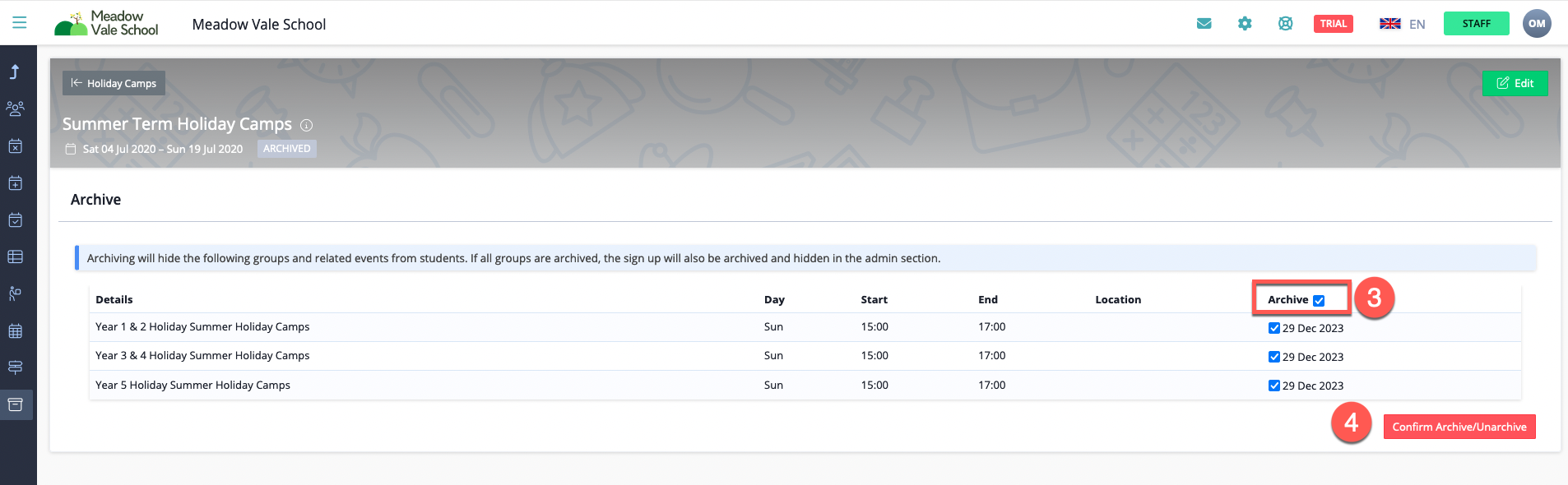 This will also archive all the groups inside it, helping to keep things tidy for admins, teachers, and parents.