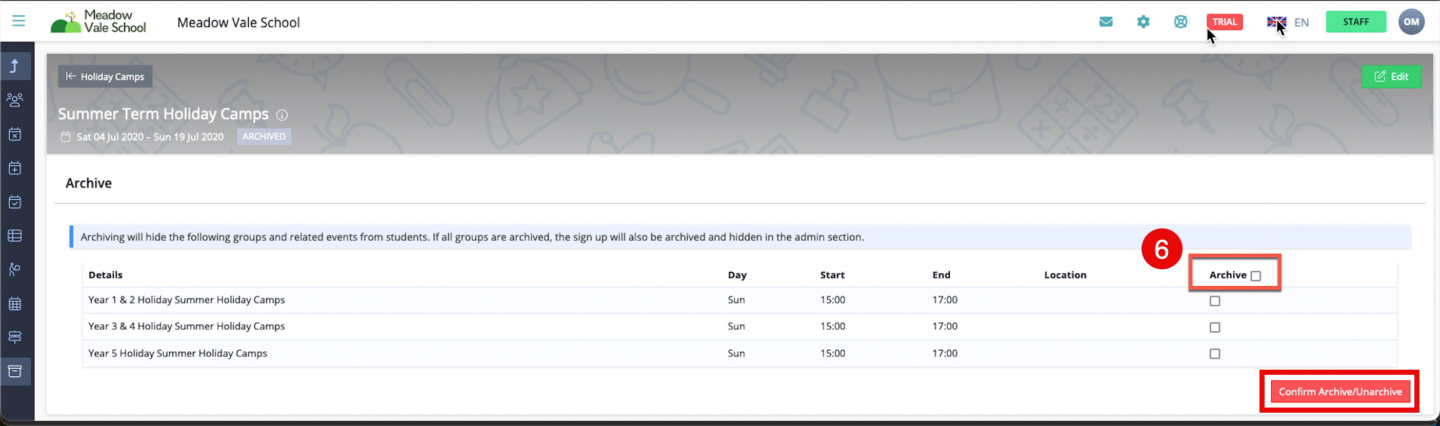 If you only want to archive certain groups, simply untick the boxes next to the groups you wish to exclude. - Once the correct groups have been selected, click the red 'Confirm Archive' tab.