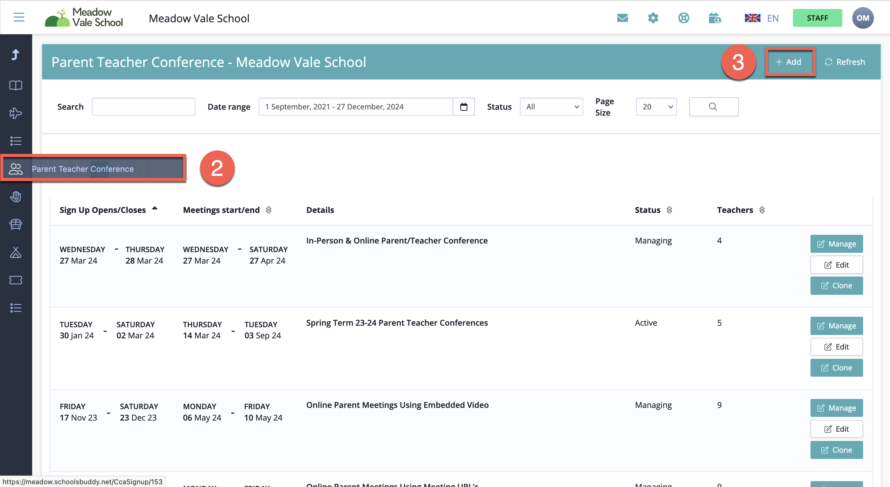 Click the 'Parent Teacher Conference' container type Click '+Add' to create a new container