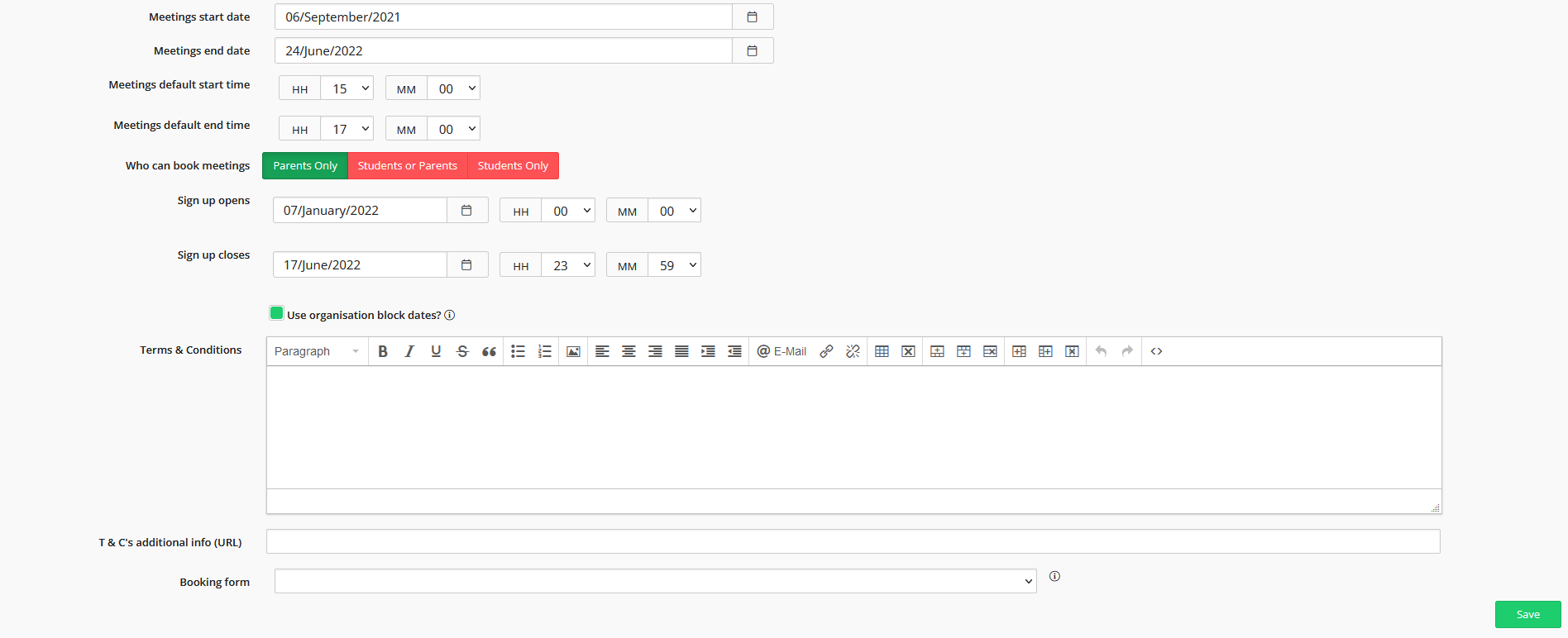- Terms & Conditions: You can enter any Terms & Conditions for the parent to agree to before making a booking, or link to a page of your school's Terms and Conditions hosted on your website by entering this URL in the Terms & Conditions' additional info (URL) box.