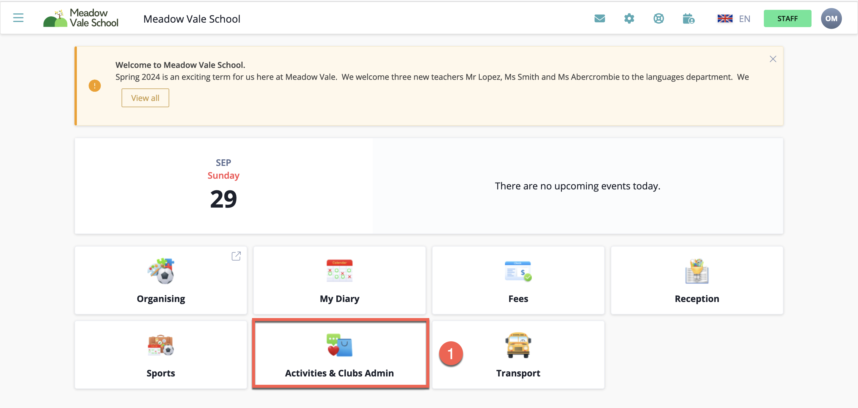 - Click the Activities & Clubs / Bookings Admin tab (this may be labelled differently due to your School's preferences)