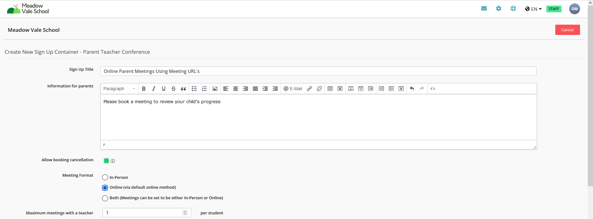 Maximum meetings with a teacher per student: If you would like parents to book more than 1 meeting with a teacher, change this to the number of meetings they can book. Otherwise please leave it as 0.
