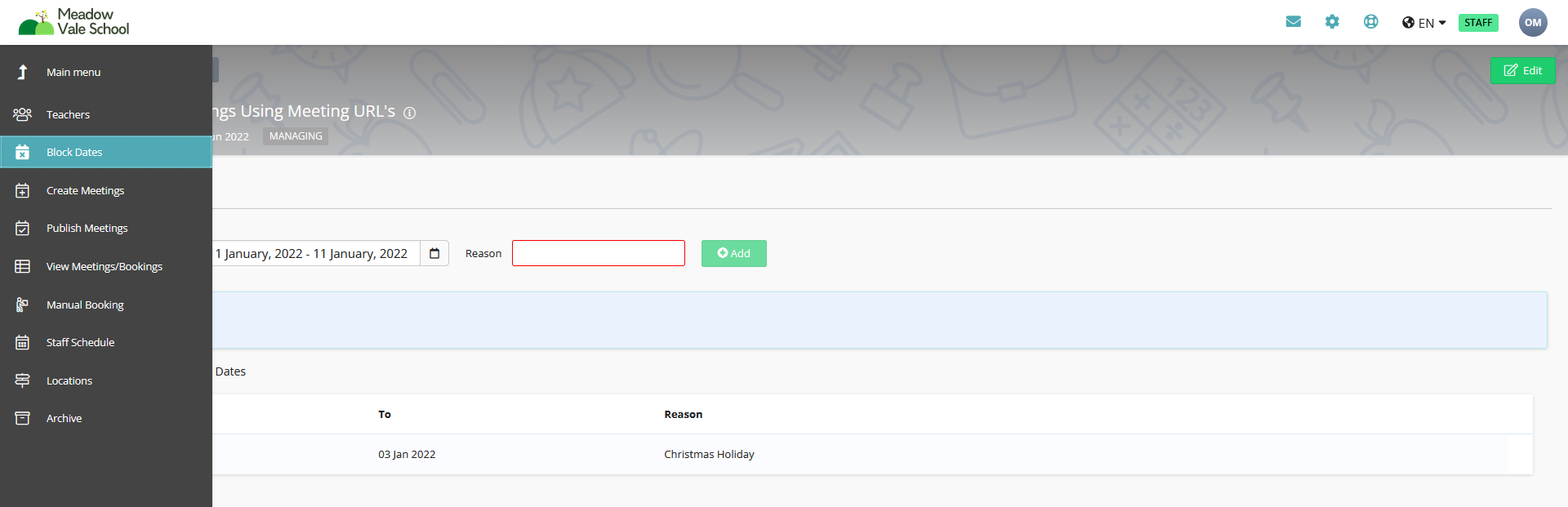 The Block Date feature is less relevant for PTC, as you typically won’t schedule conferences on public holidays or similar dates. This page mainly serves as a review, allowing you to see which dates the school has marked as Block Dates.