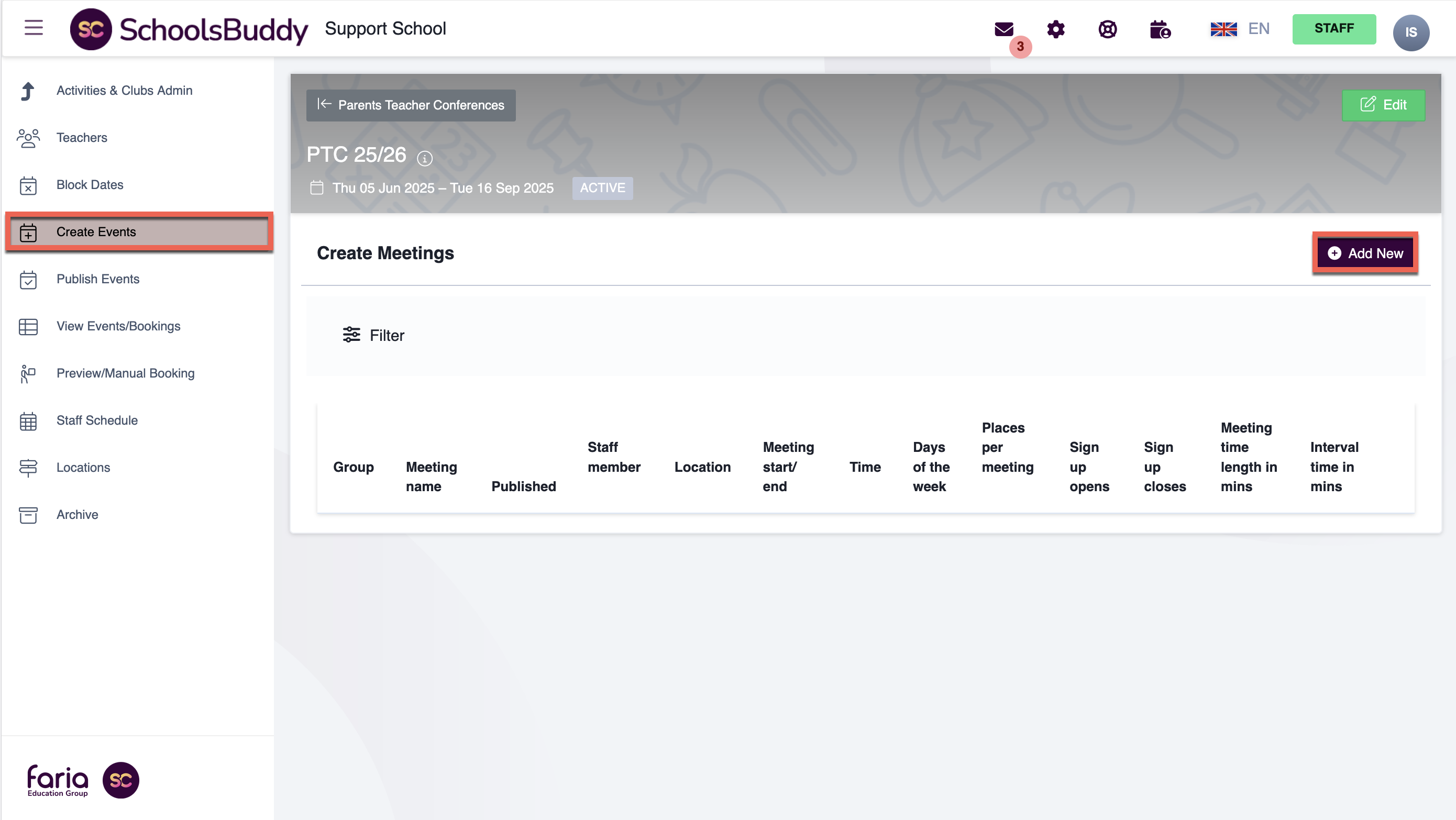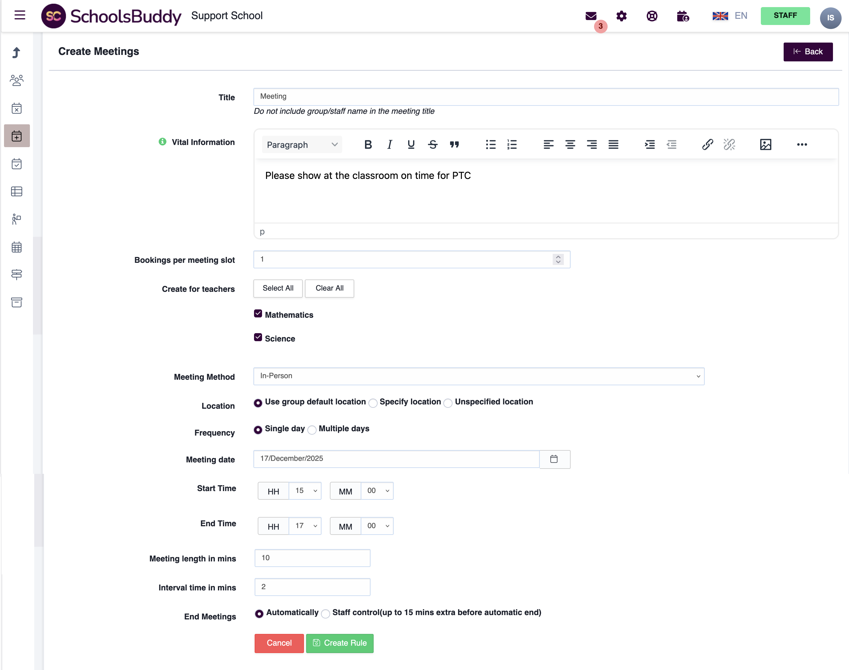 - Interval time in mins: Add a time length if teachers need a break between every meeting.