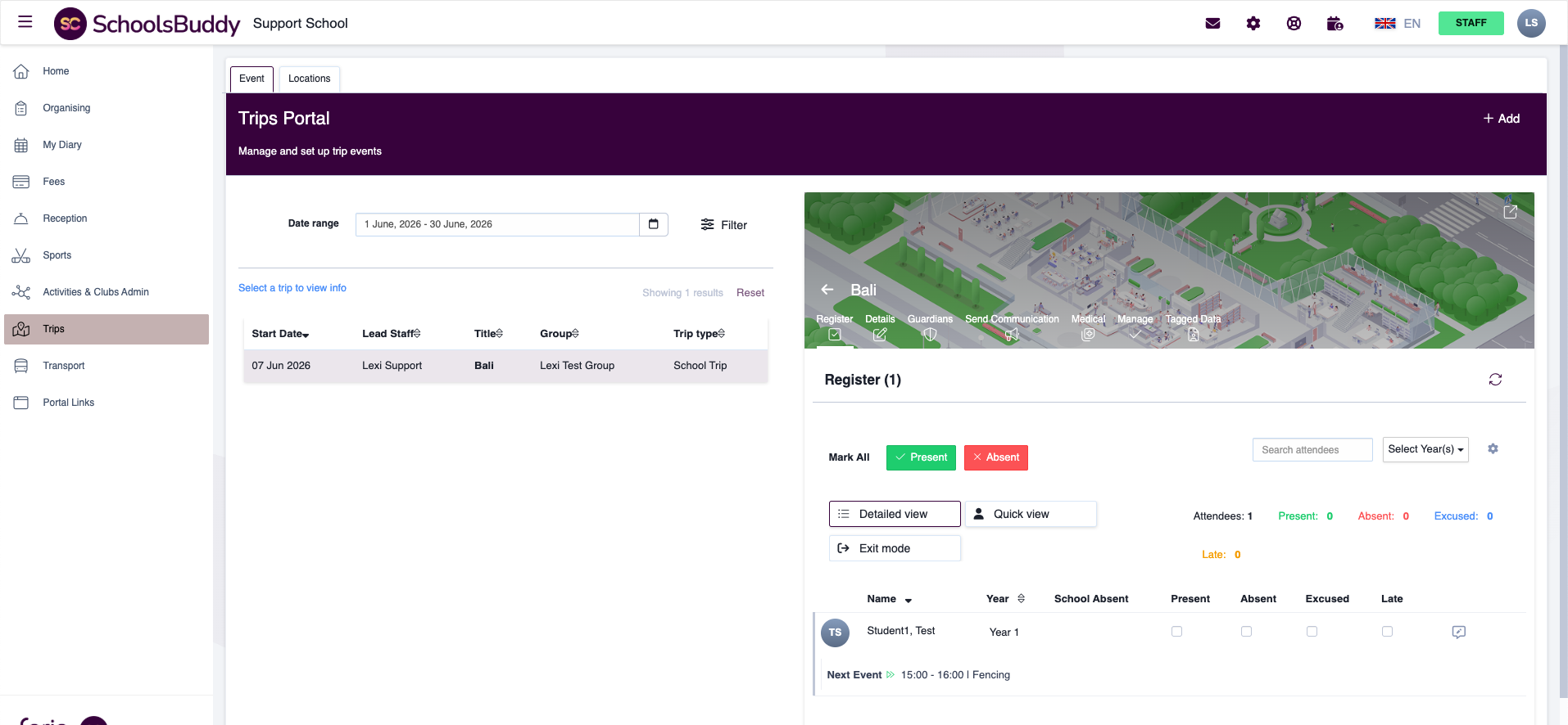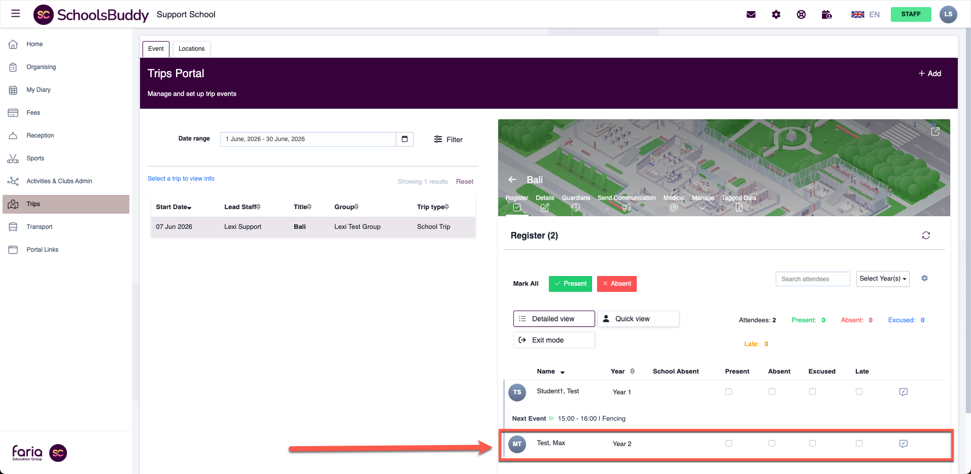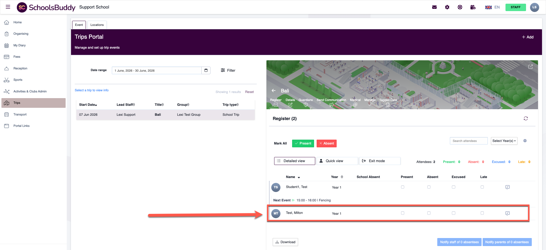 Once saved, the student will appear on the trip register, and the event will also appear in the parent’s and student’s diary.