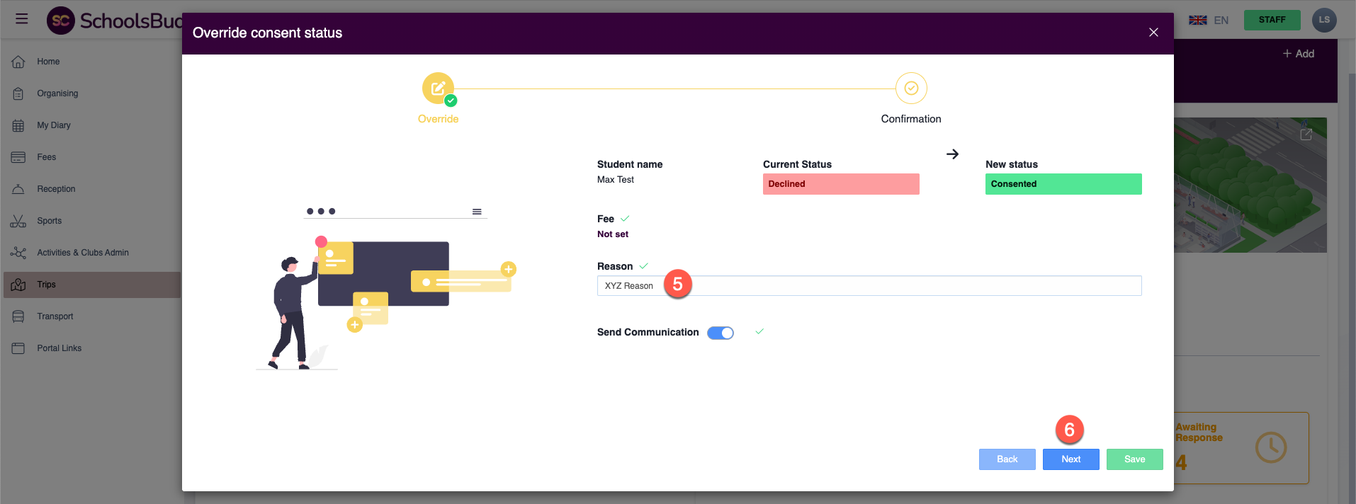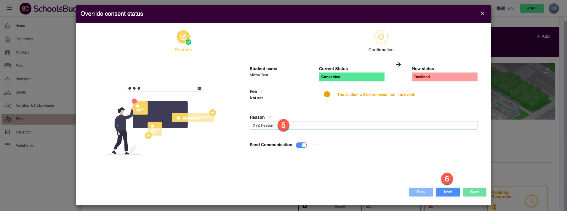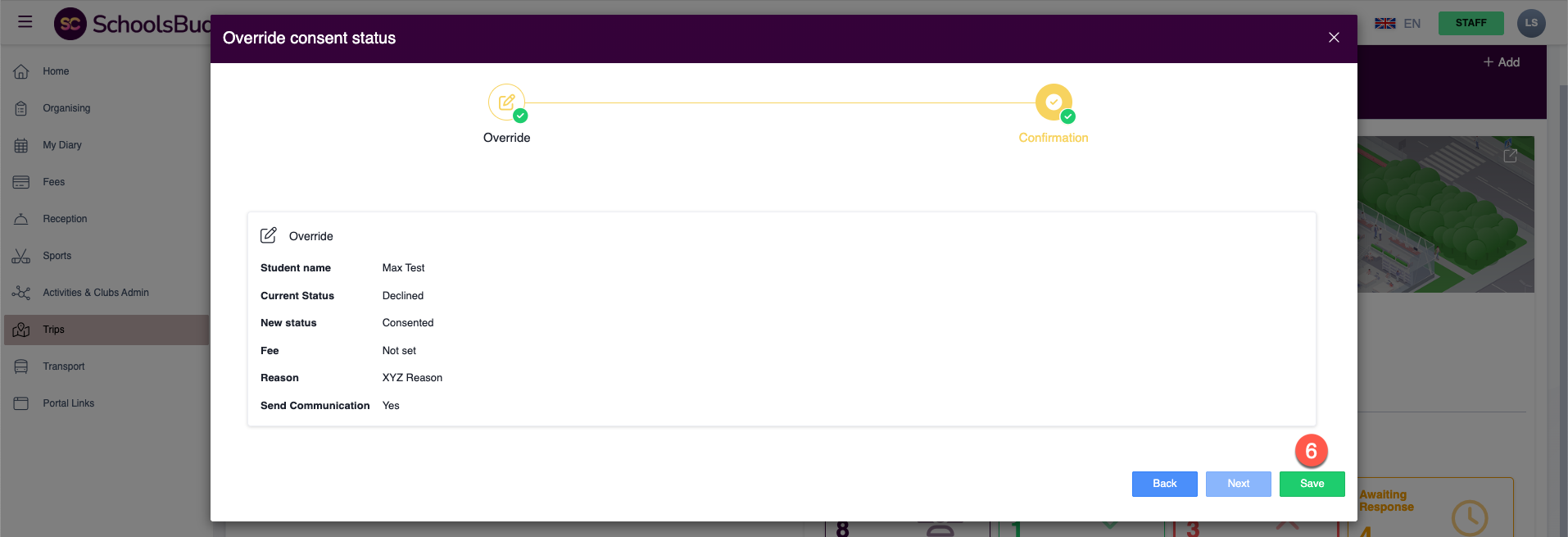 Once saved, the student’s status will change from Consented to Declined, and the student will be removed from the trip register.