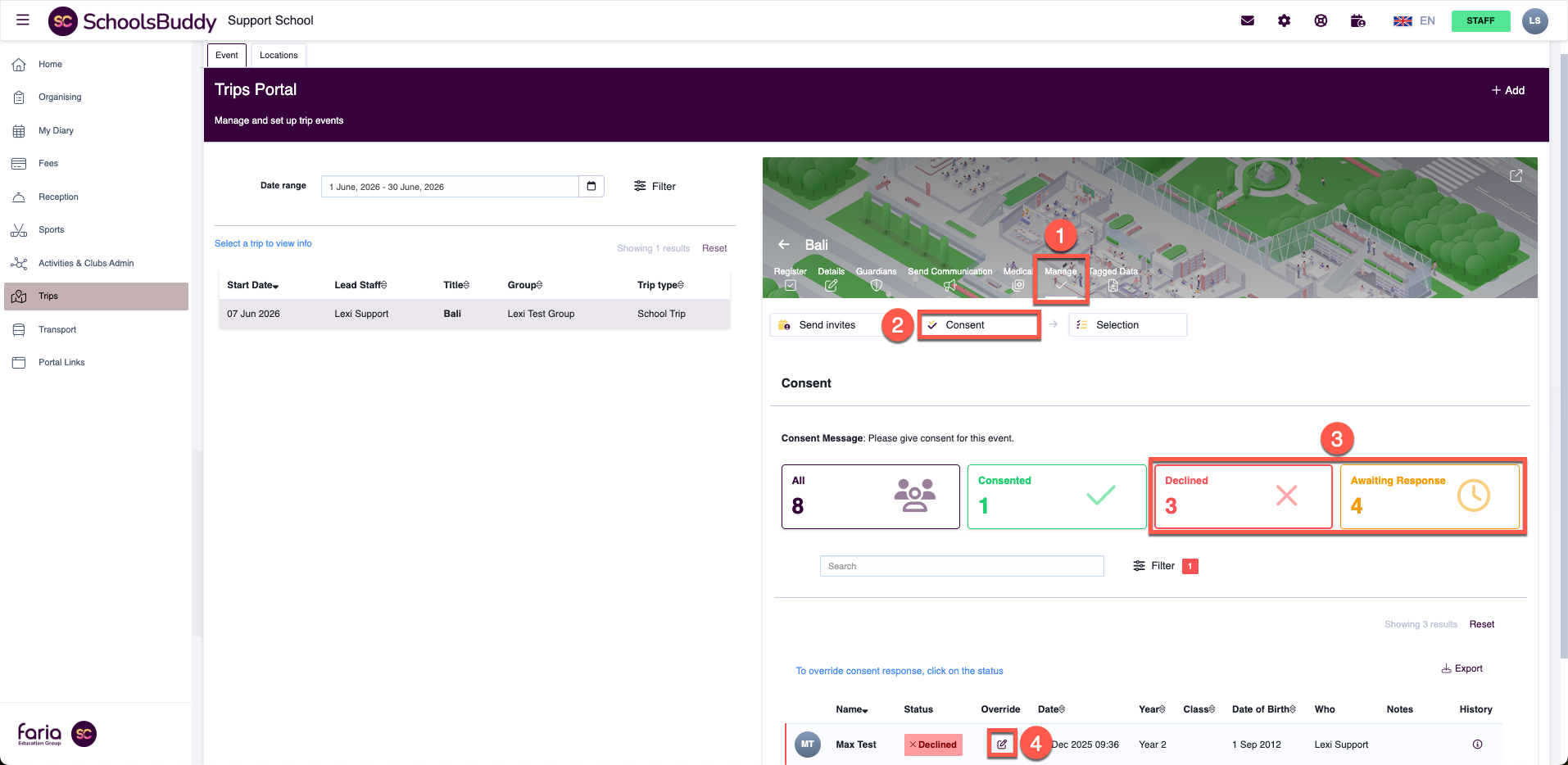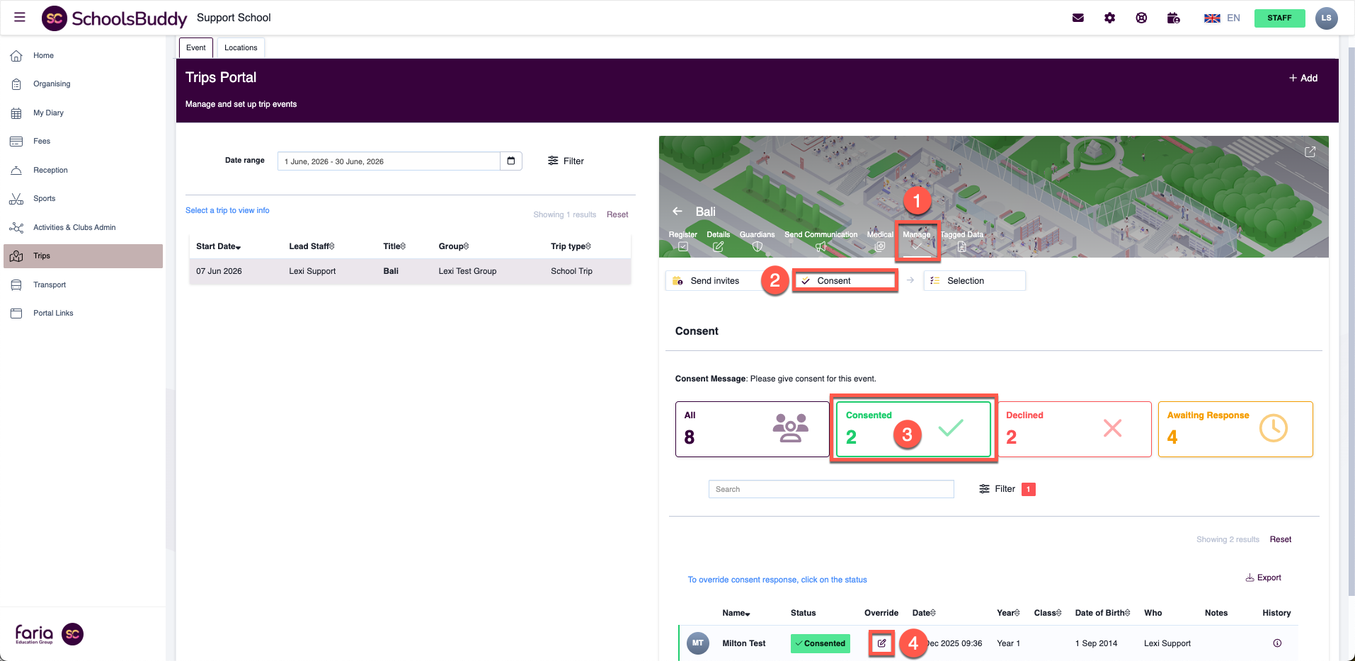 This article explains how staff can update student sign-ups for a trip by overriding parent consent. Once a parent has submitted consent, it cannot be changed by the parent. Any updates must be made by staff from the school side.