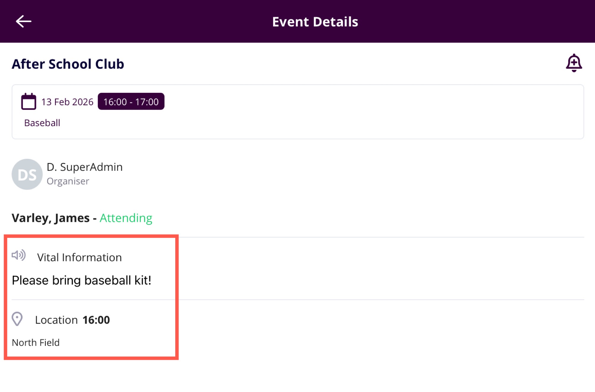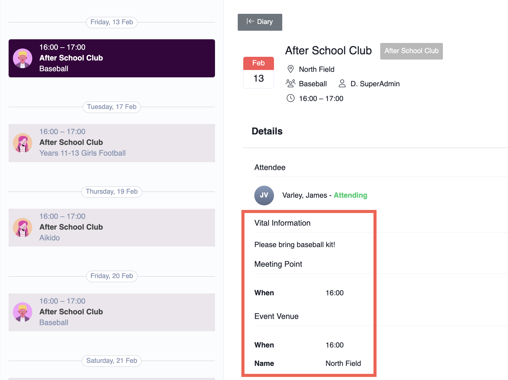 Tap on any diary entry to view more details, such as the time, location, and additional notes from the school.