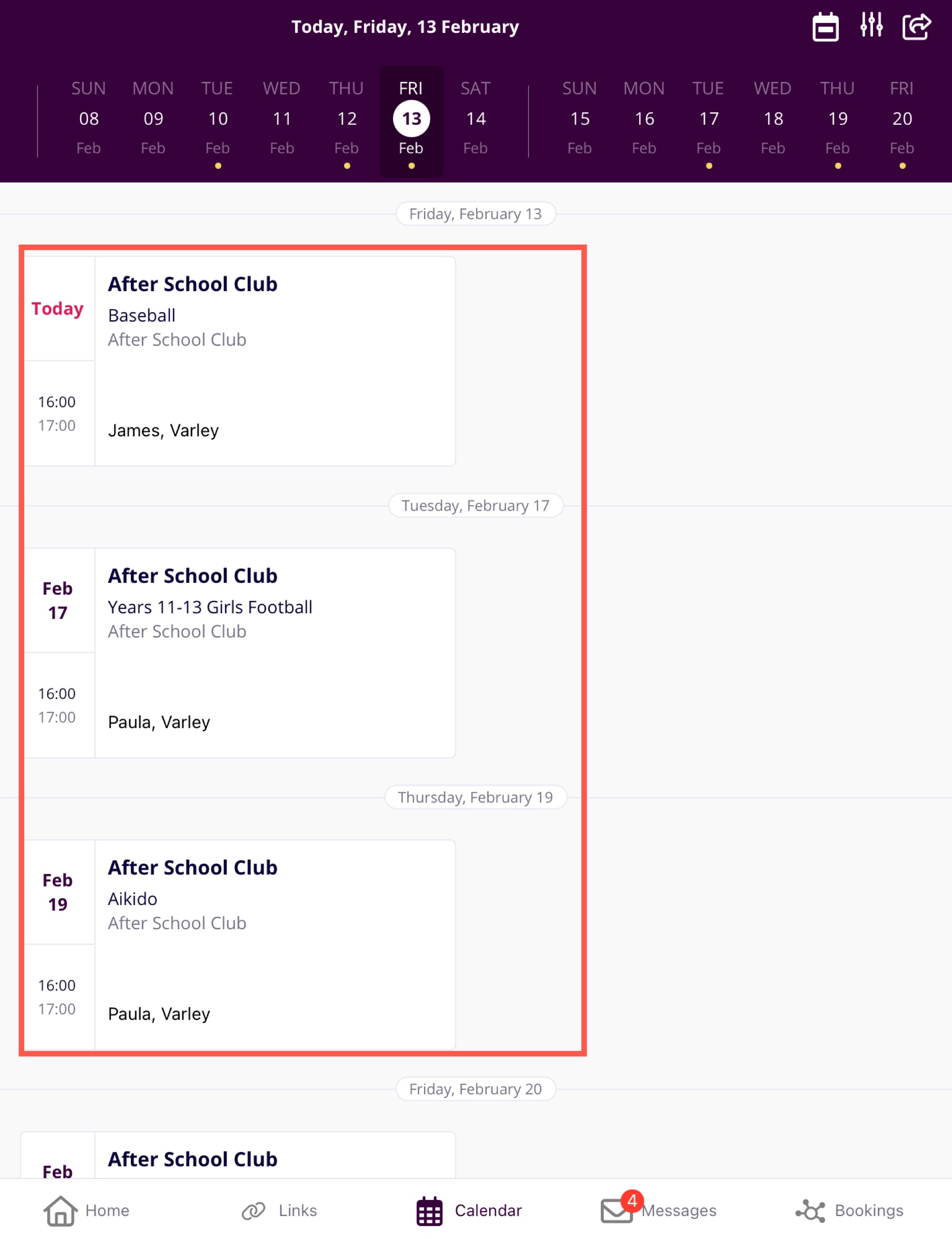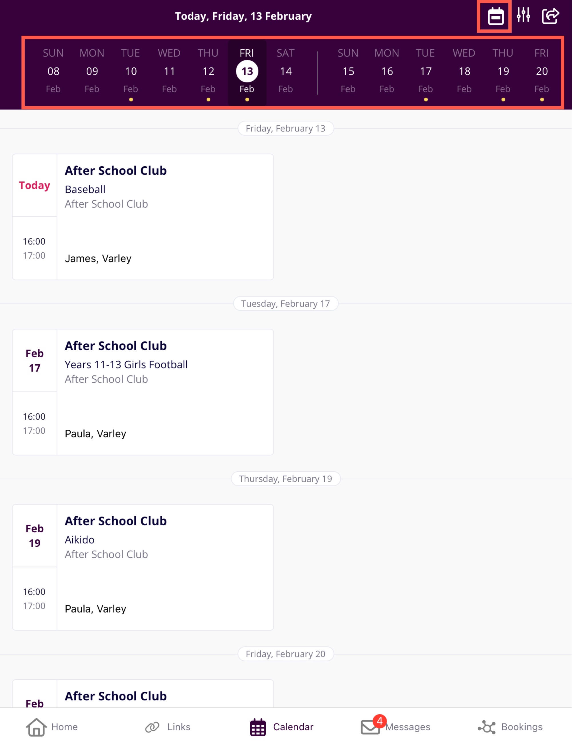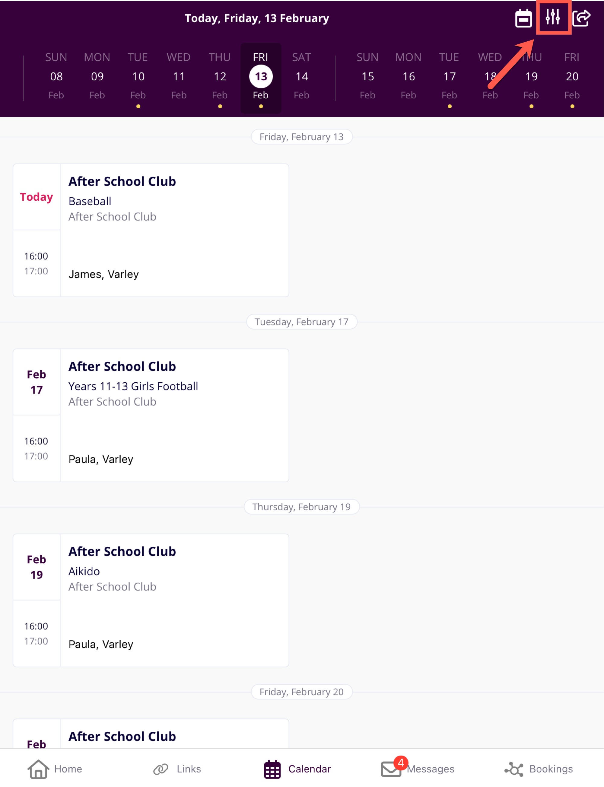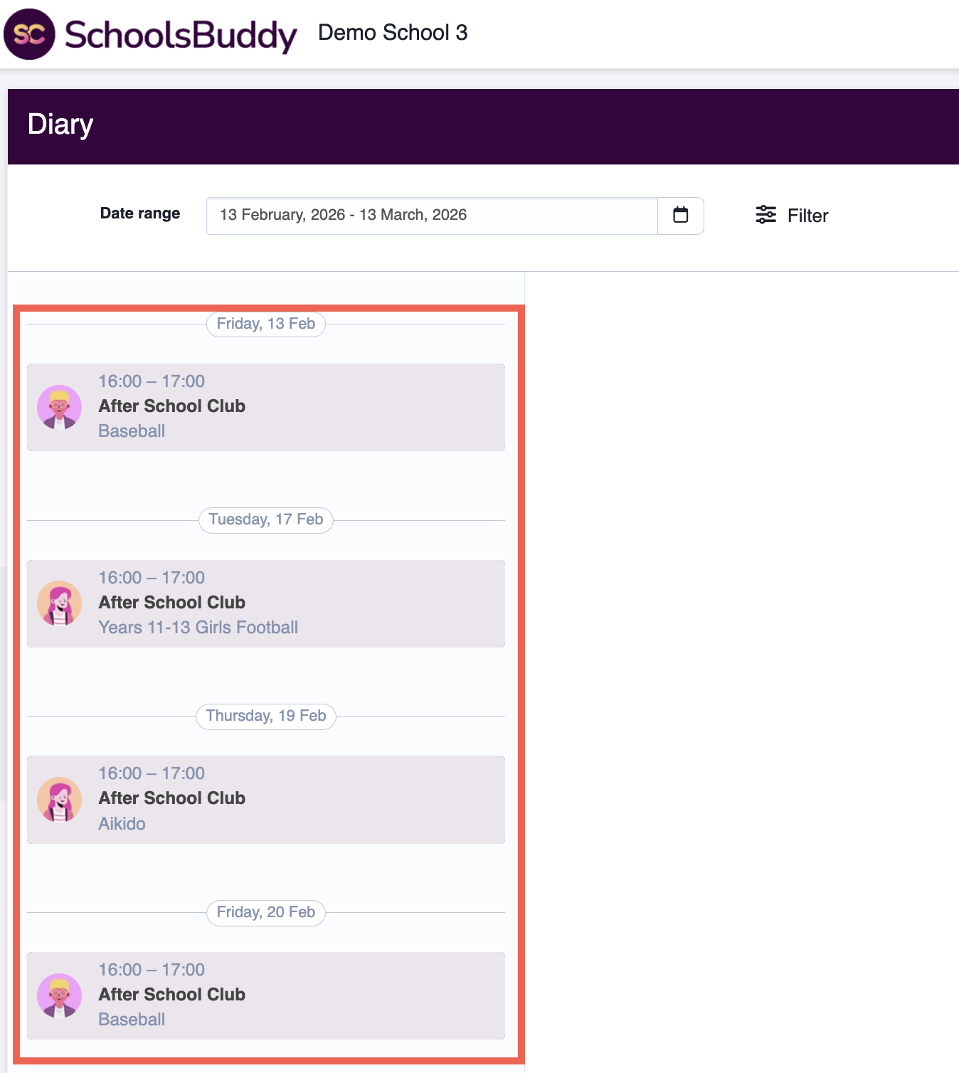 The diary will update automatically to show the selected child’s schedule.