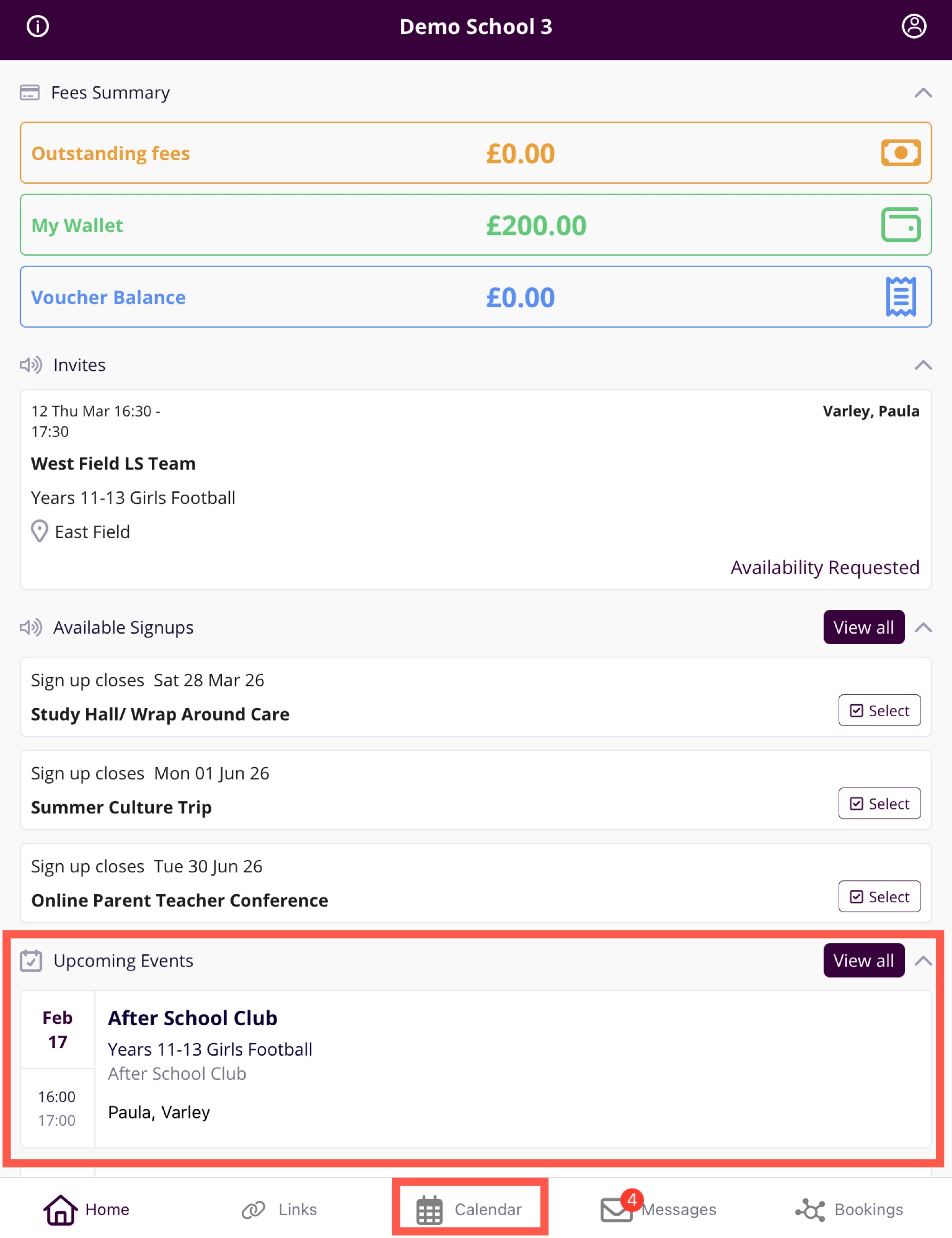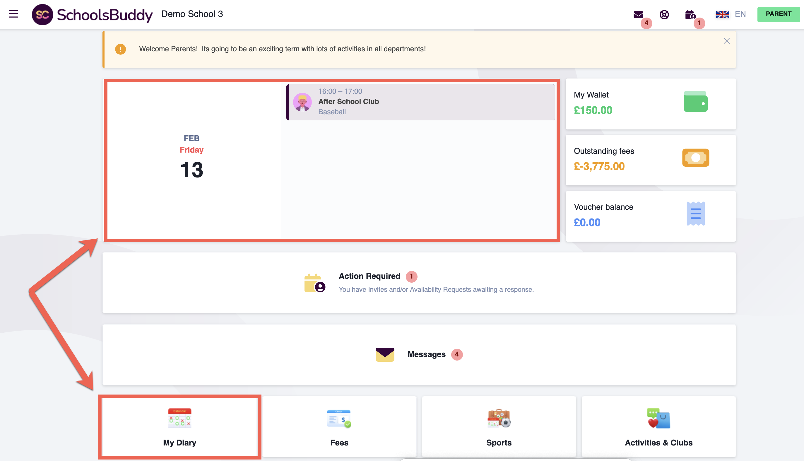 - On your homepage, you will see your children's event for today, Click on the date to go to the diary/calendar