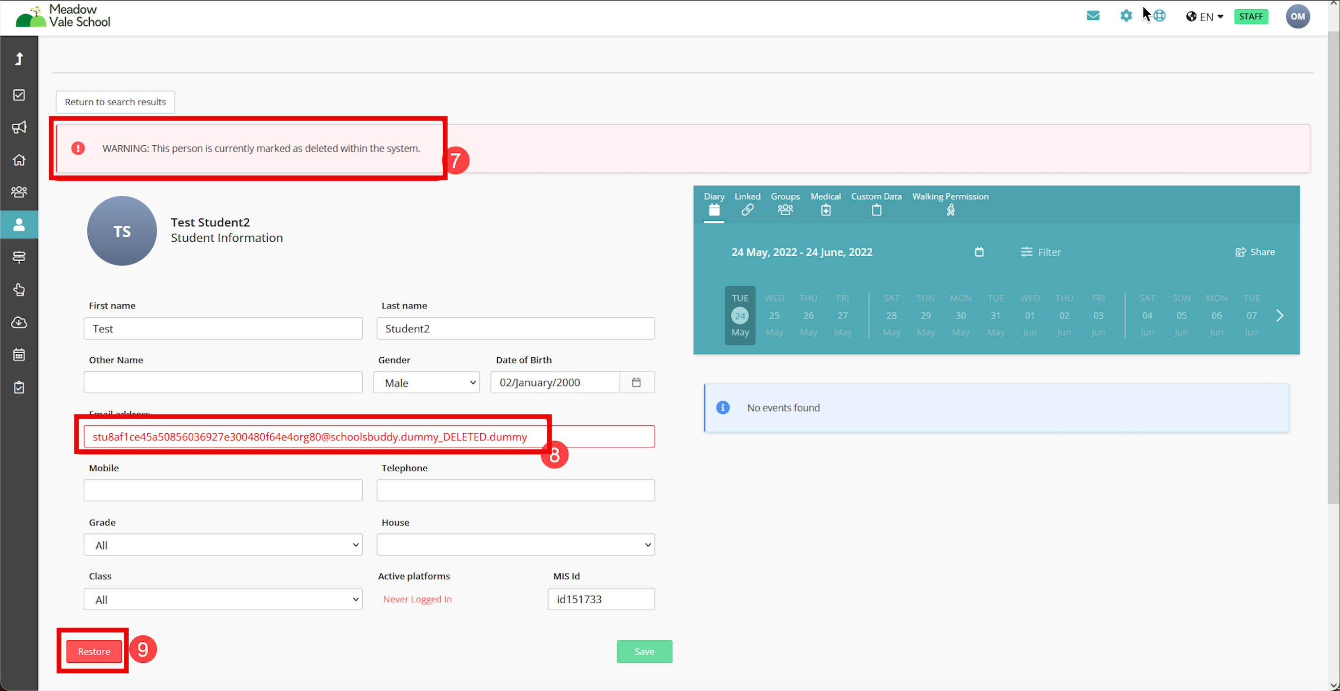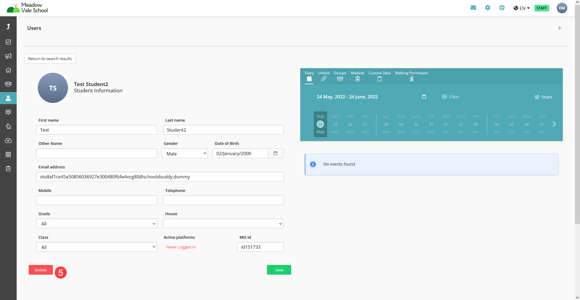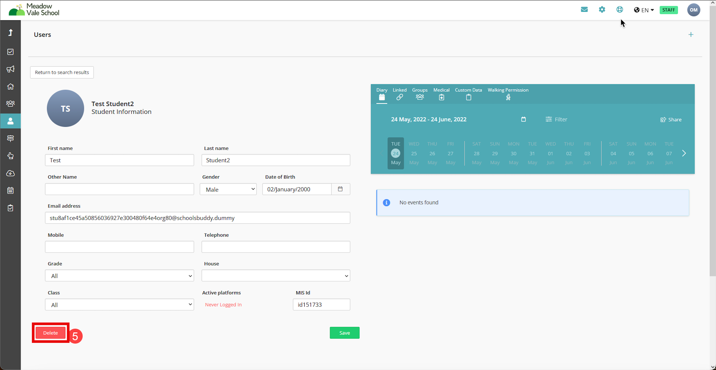 N.B. Only Organisation Super Admin users can delete records in SchoolsBuddy. If you require this role please contact: help@schoolsbuddy.com